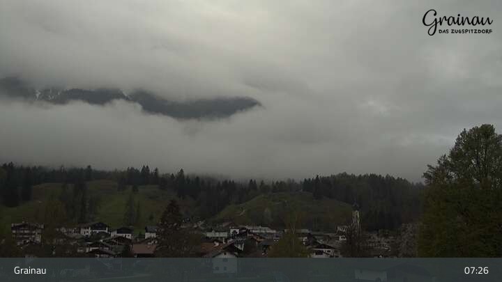 Die Live-Webcam zeigt vom Freibad aus einen Rundumblick auf das Bergdorf Grainau und seine Umgebung. Zu sehen sind unter anderem die Zugspitze, der große und kleine Waxenstein sowie der Hohe Ziegspitz.