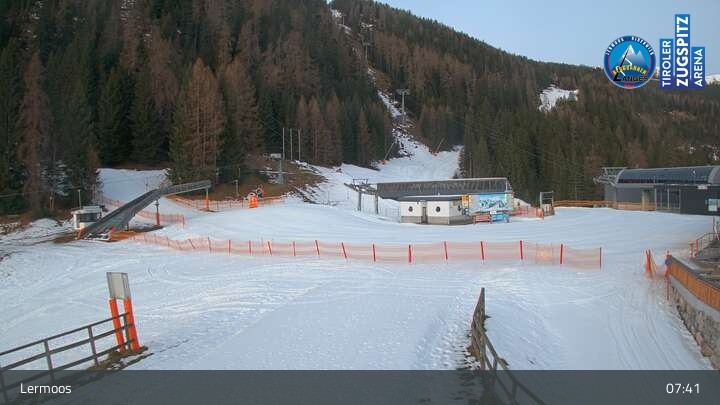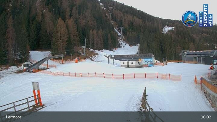 Die Webcam befindet sich an der Bergstation des Hochmoos Express in Lermoos und blickt auf die umliegenden Alpen.