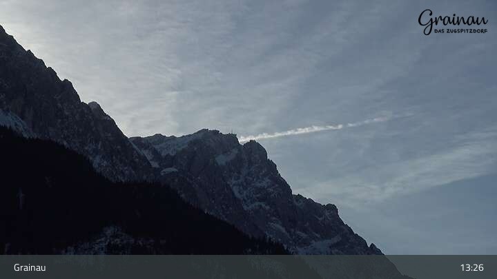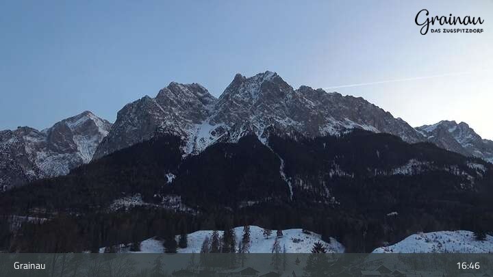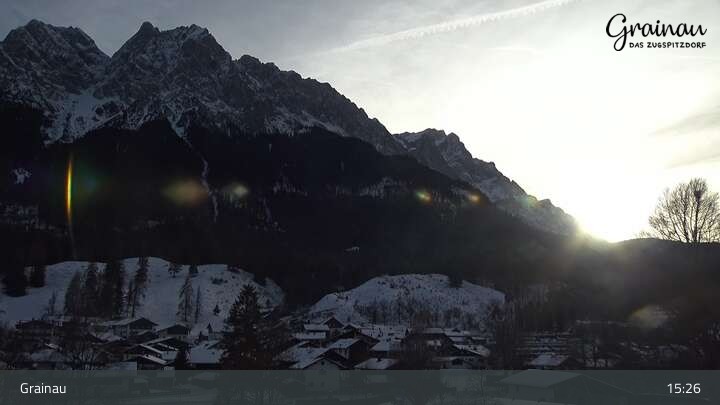 Die Live-Webcam zeigt vom Freibad aus einen Rundumblick auf das Bergdorf Grainau und seine Umgebung. Zu sehen sind unter anderem die Zugspitze, der große und kleine Waxenstein sowie der Hohe Ziegspitz.