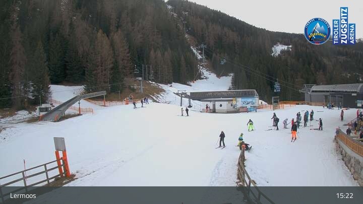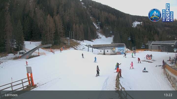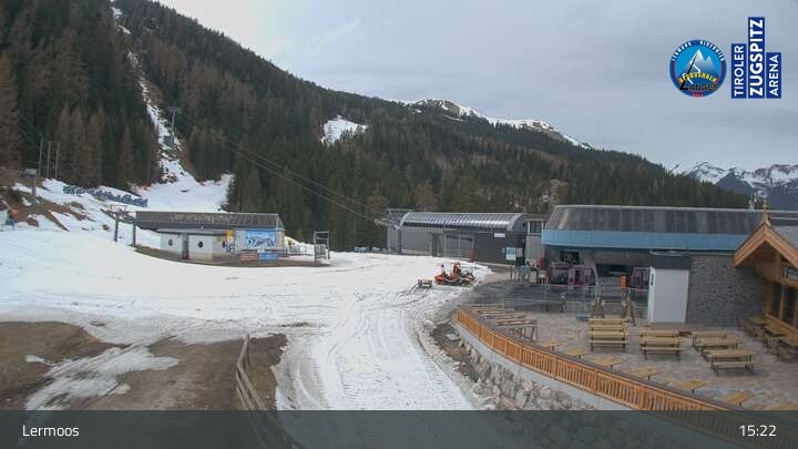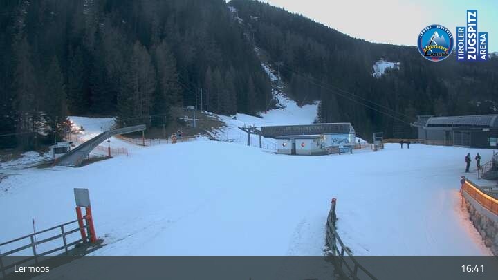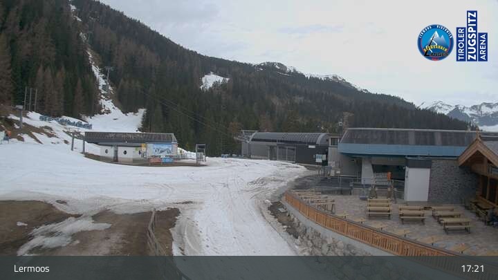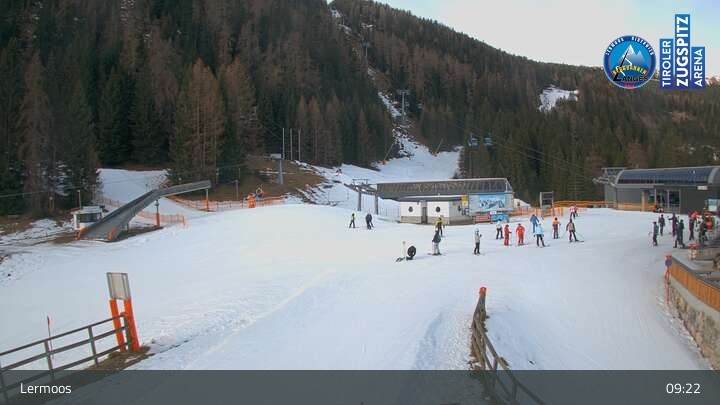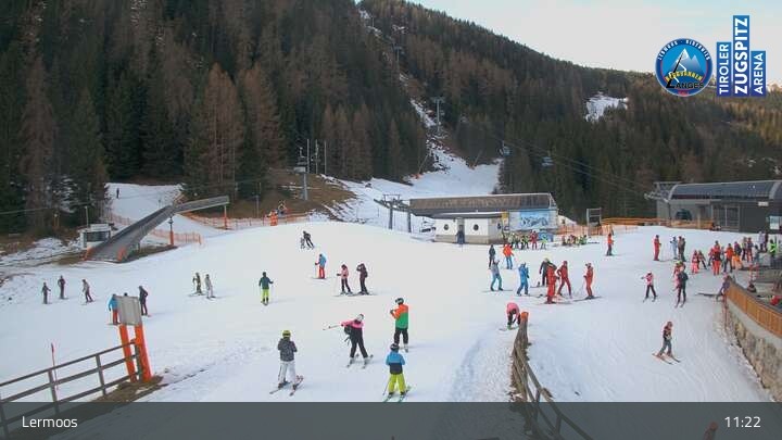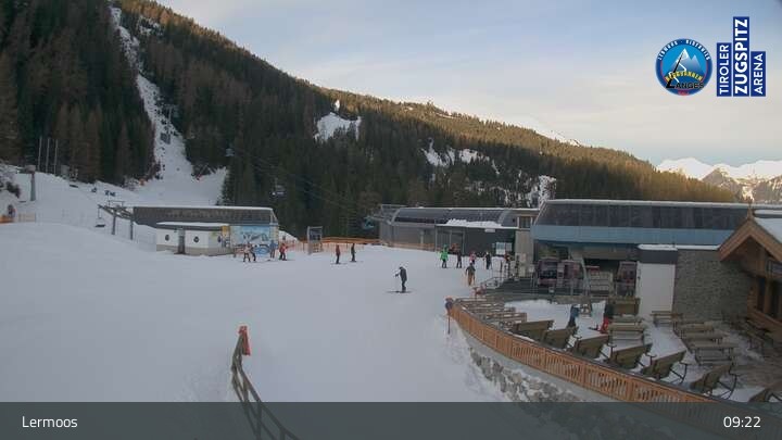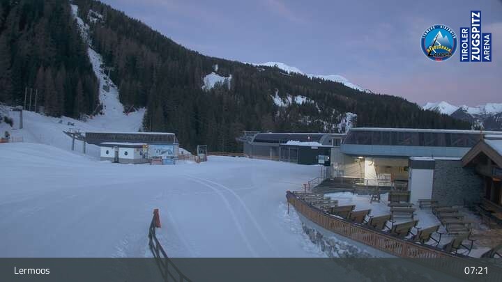 Die Webcam befindet sich an der Bergstation des Hochmoos Express in Lermoos und blickt auf die umliegenden Alpen.