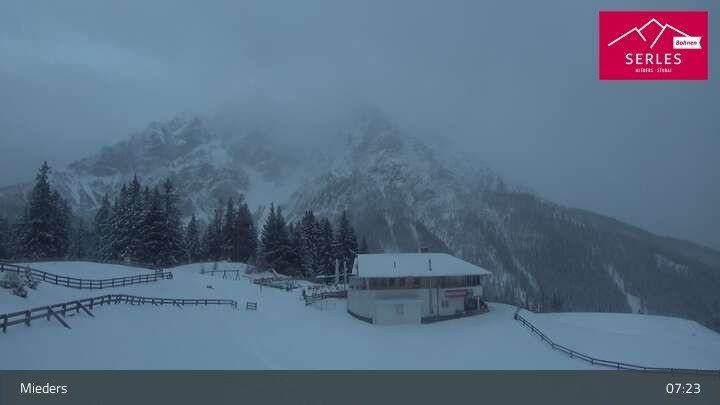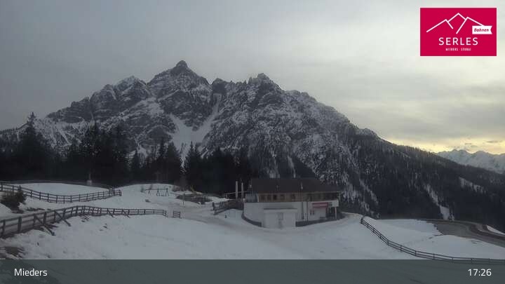 Die Webcam eröffnet den Blick von der Bergstation Koppeneck auf den Hausberg von Mieders, die Serles. Zu sehen sind außerdem das Bergrestaurant Koppeneck mit Kinderspielplatz und der Speichersee.