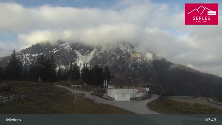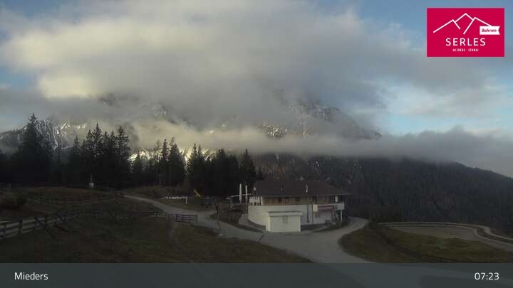 Die Webcam eröffnet den Blick von der Bergstation Koppeneck auf den Hausberg von Mieders, die Serles. Zu sehen sind außerdem das Bergrestaurant Koppeneck mit Kinderspielplatz und der Speichersee.