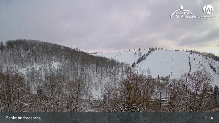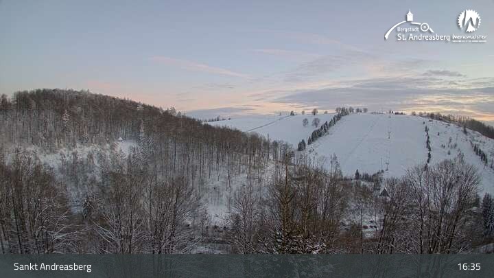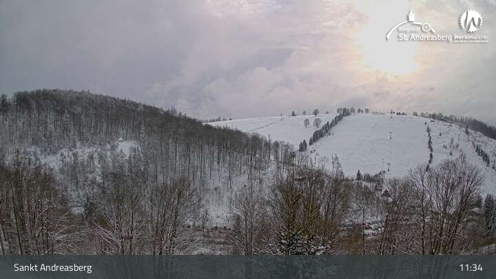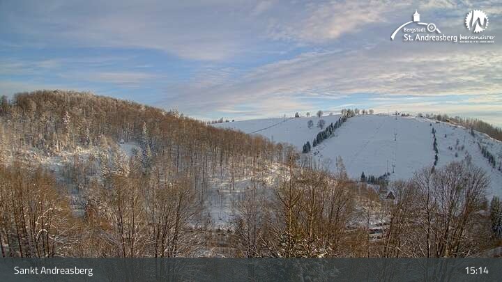 Die Kamera blickt vom Harz-BnB Werkmeister in Sankt Andreasberg nach Süden auf die Alberti-Lifte am Matthias-Schmidt-Berg. Im Winter sind die Lifte für Skifahrer in Betrieb, im Sommer wartet hier eine Sommerrodelbahn sowie ein Mountainbike- und Downhill-Erlebnispark.