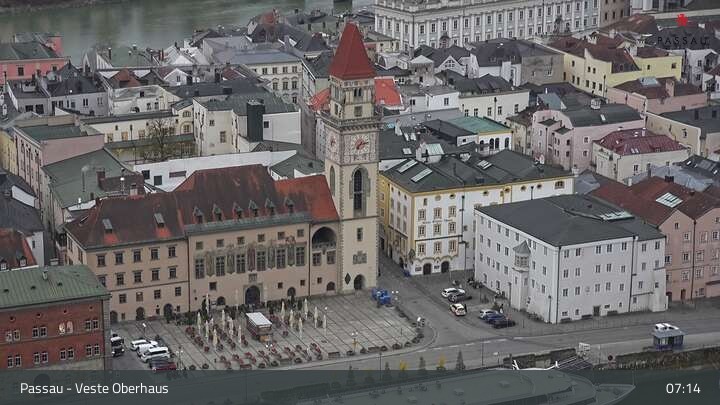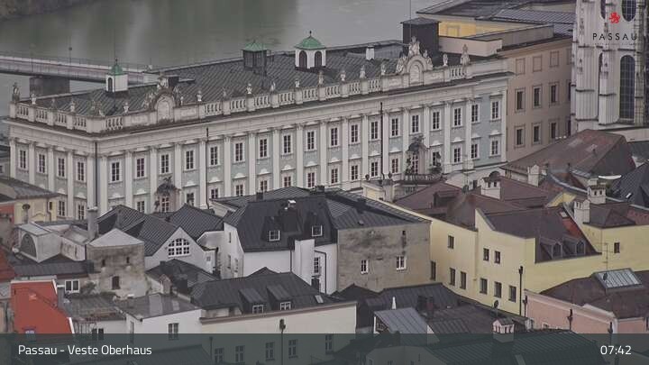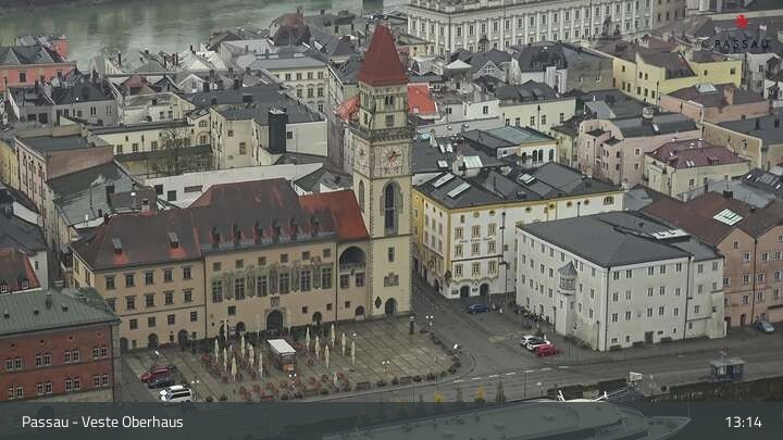 Die Webcam zeigt dir den Blick von der Veste Oberhaus über die Donau zur Altstadt der niederbayerischen Stadt Passau. Sehr gut zu erkennen sind links Teile der Burgveste, die Ortspitze wo die drei Flüsse Donau, Inn und Ilz zusammenfließen, die Hängebrücke über die Donau und rechts der weiße Stephansdom.