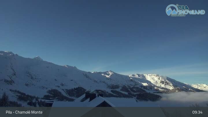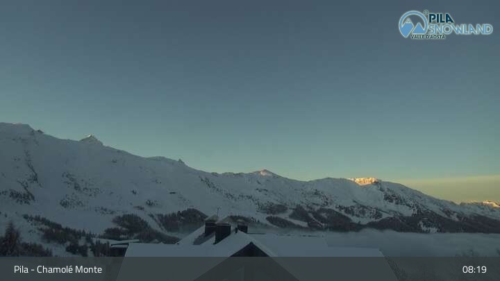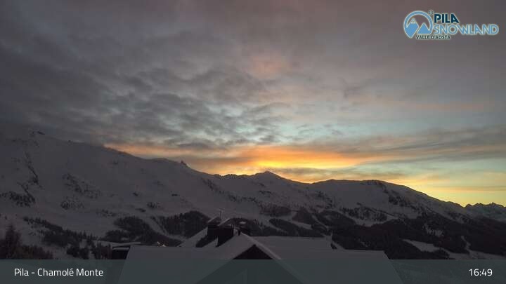 Die Webcam befindet sich an der Bergstation des Chamolé Sessellifts und blickt über die Berge des Aostatals.