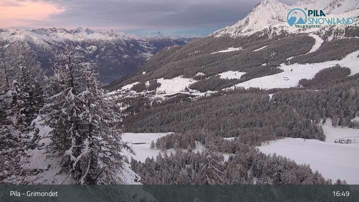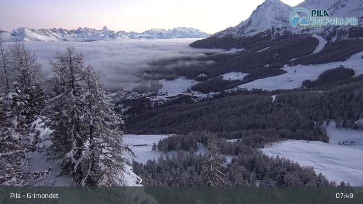 Diese Webcam an der Bergstation des Sessellifts Grimondet blickt auf die umliegende Bergwelt von Pila im Aostatal.
