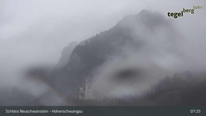 Die Kamera befindet sich am Schloss Hohenschwangau und schwenkt vom Schloss Neuschwanstein zum Museum der Bayerischen Könige.
