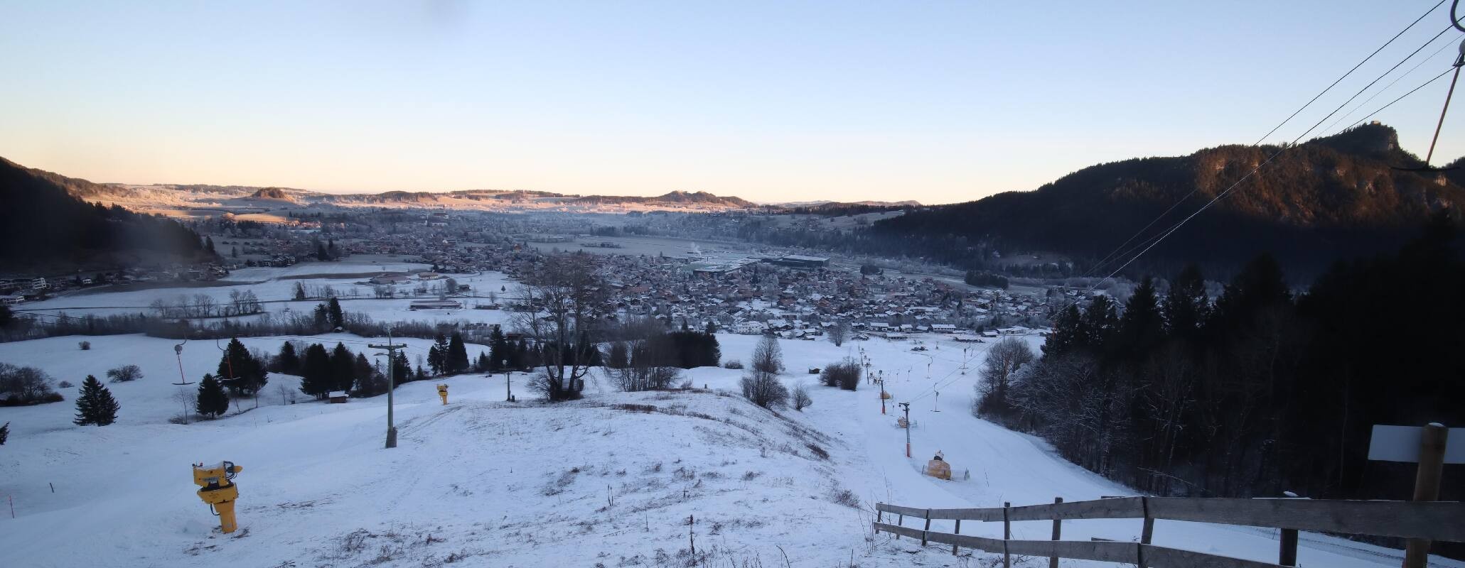 Die Panoramakamera blickt vom Alpenbad über die Außenbecken auf Pfronten im Allgäu. Im Hintergrund ist der markante Kienberg zu sehen.