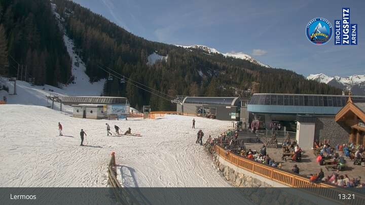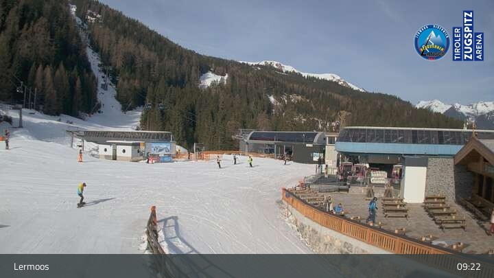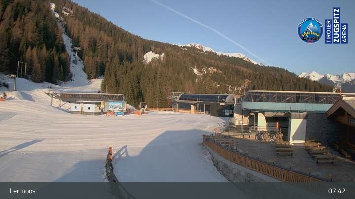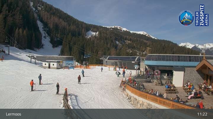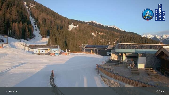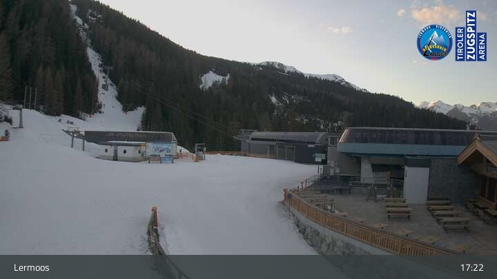 Die Webcam befindet sich an der Bergstation des Hochmoos Express in Lermoos und blickt auf die umliegenden Alpen.