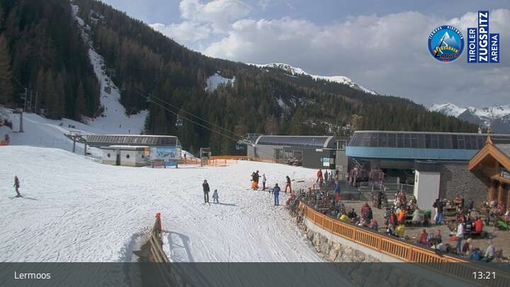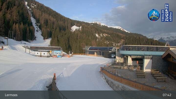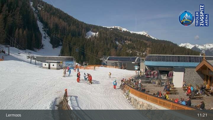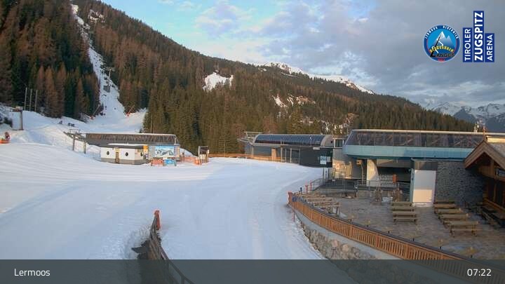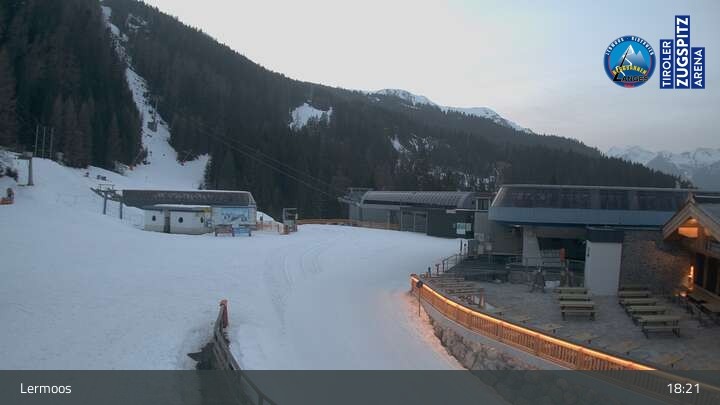 Die Webcam befindet sich an der Bergstation des Hochmoos Express in Lermoos und blickt auf die umliegenden Alpen.