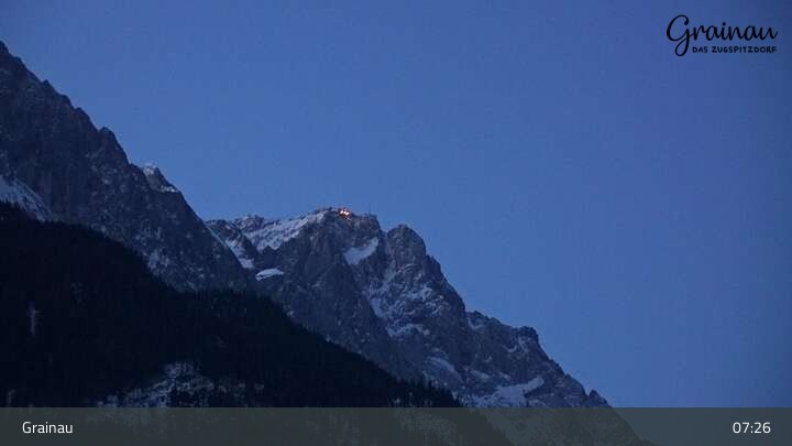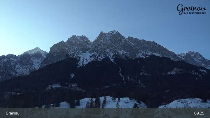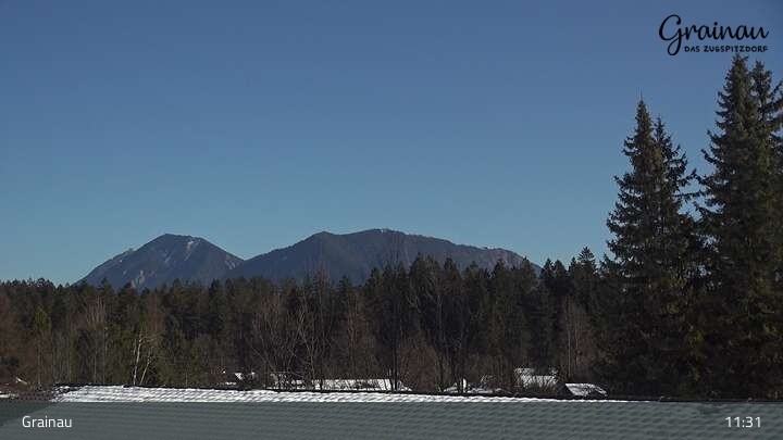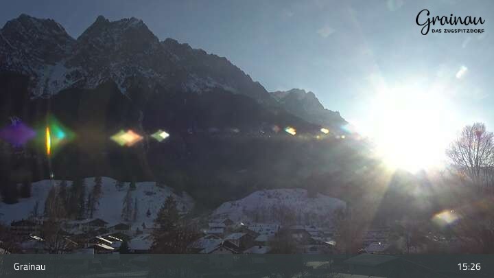 Die Live-Webcam zeigt vom Freibad aus einen Rundumblick auf das Bergdorf Grainau und seine Umgebung. Zu sehen sind unter anderem die Zugspitze, der große und kleine Waxenstein sowie der Hohe Ziegspitz.