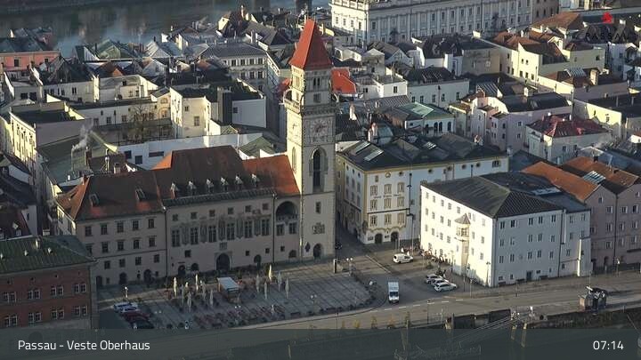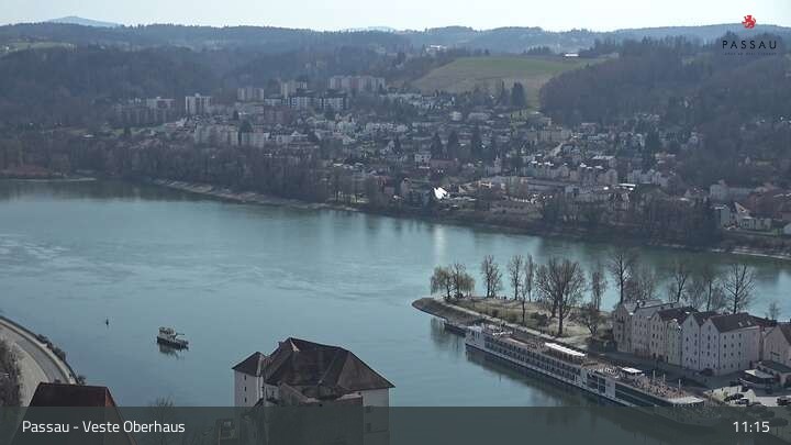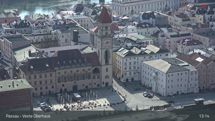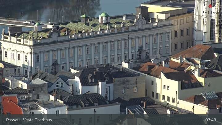 Die Webcam zeigt dir den Blick von der Veste Oberhaus über die Donau zur Altstadt der niederbayerischen Stadt Passau. Sehr gut zu erkennen sind links Teile der Burgveste, die Ortspitze wo die drei Flüsse Donau, Inn und Ilz zusammenfließen, die Hängebrücke über die Donau und rechts der weiße Stephansdom.