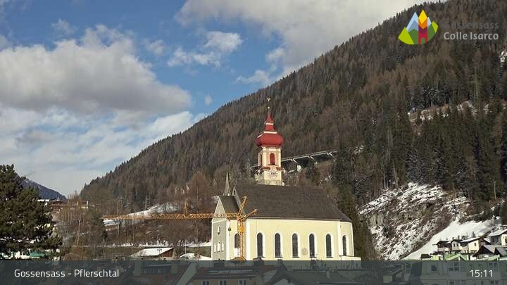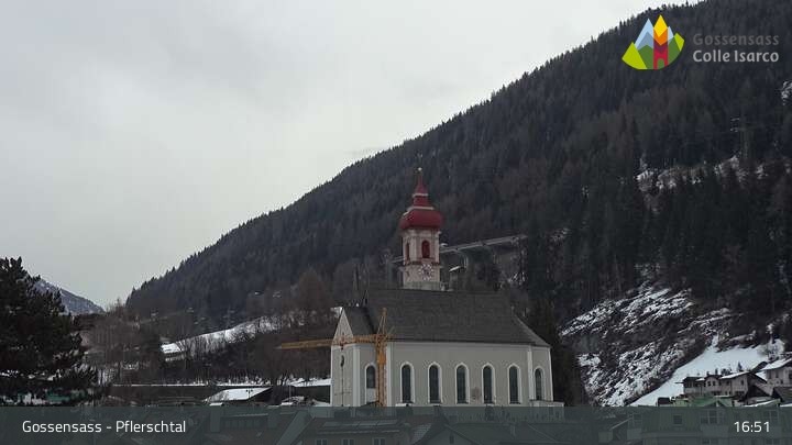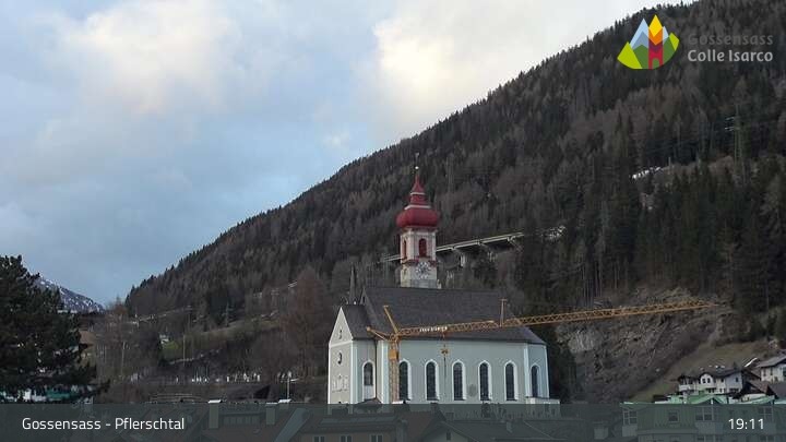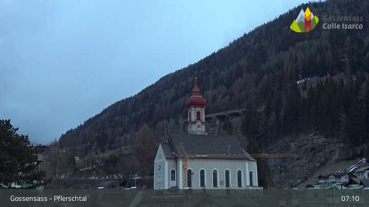 Die Kamera zeigt die Kirche Parrocchia San Valentino in Gossensass im Eisacktal.