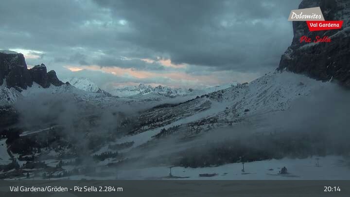 Ausblick von der Bergstation am Piz Sella in Val Gardena in Südirol. Zu sehen sind u.a. der Langkofel und die Sellagrupee.