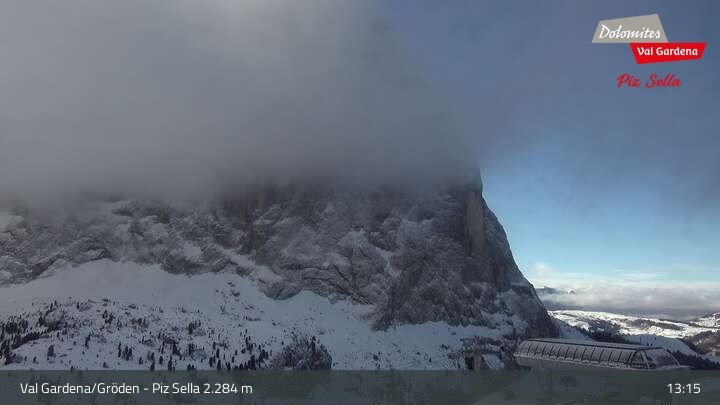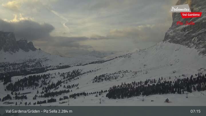 Ausblick von der Bergstation am Piz Sella in Val Gardena in Südirol. Zu sehen sind u.a. der Langkofel und die Sellagrupee.