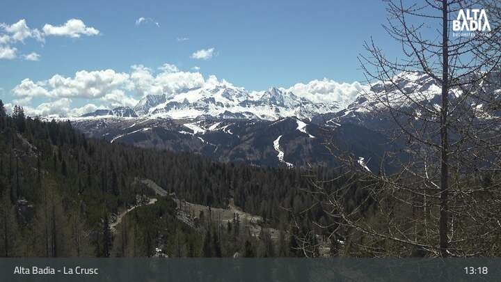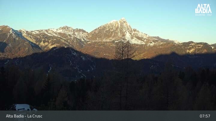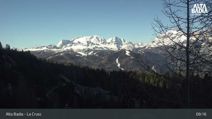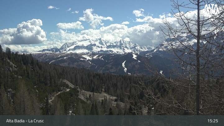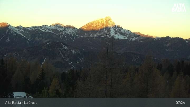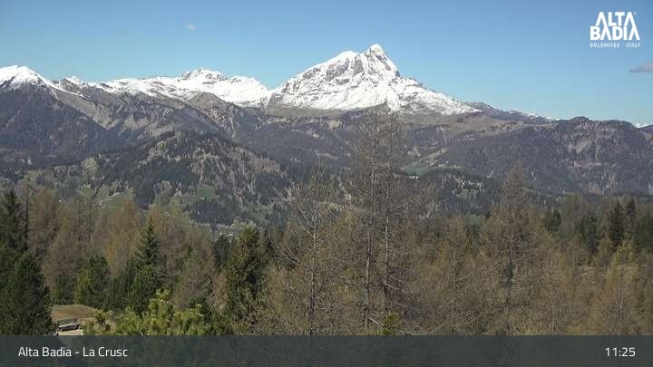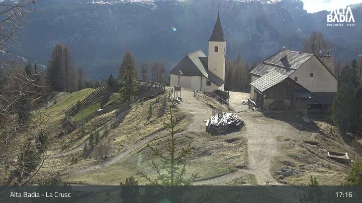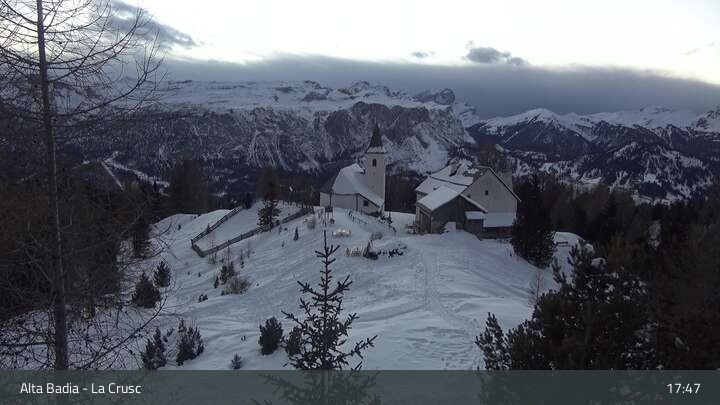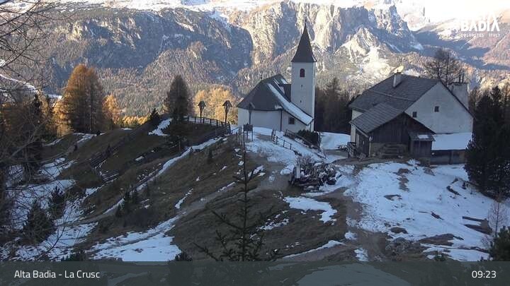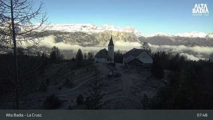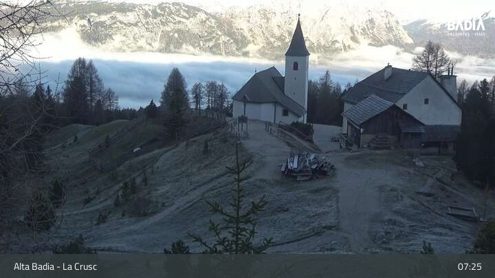 Blick von der Bergstation des La Crusc Sessellifts auf die Berge rund um Alta Badia. Die kleine Kirche ist ein beliebtes Wallfahrtsziel.