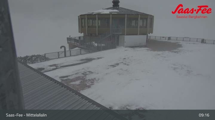 Diese Webcam auf dem Mittelallalin, einem Nebengipfel des Allalinhorns in Saas-Fee zeigt das Drehrestaurant, von dem aus man die Aussicht auf die umliegenden Walliser Alpen genießen kann.