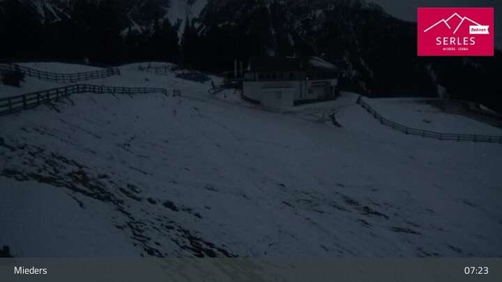 Die Webcam eröffnet den Blick von der Bergstation Koppeneck auf den Hausberg von Mieders, die Serles. Zu sehen sind außerdem das Bergrestaurant Koppeneck mit Kinderspielplatz und der Speichersee.