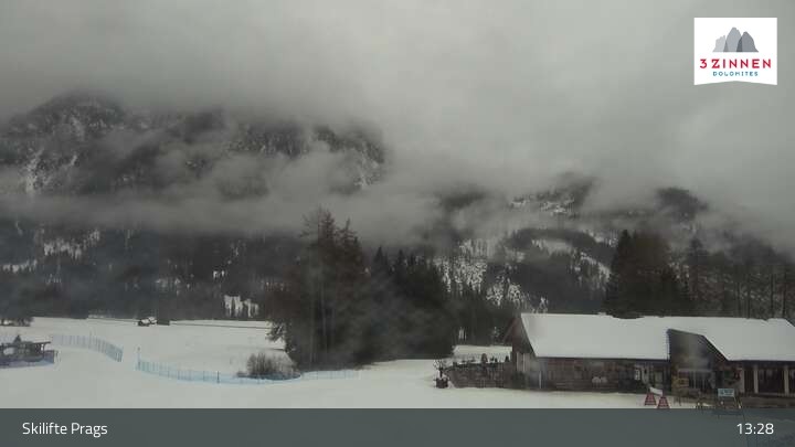 Zu sehen sind die Skilifte Prags in der Dolomitenregion Drei Zinnen. Im Hintergrund ist auch der markante Dürrenstein zu erkennen.