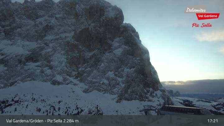 Ausblick von der Bergstation am Piz Sella in Val Gardena in Südirol. Zu sehen sind u.a. der Langkofel und die Sellagrupee.