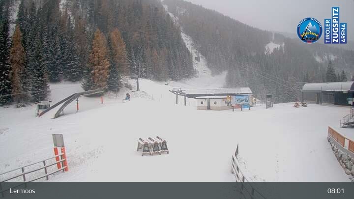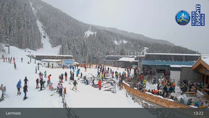 Die Webcam befindet sich an der Bergstation des Hochmoos Express in Lermoos und blickt auf die umliegenden Alpen.