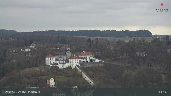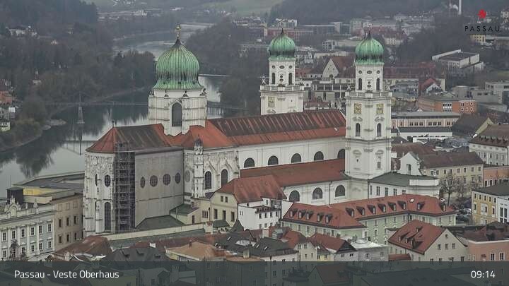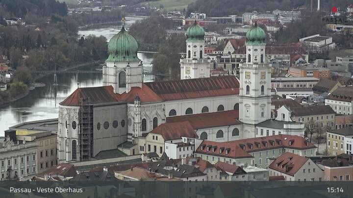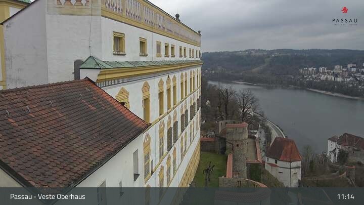 Die Webcam zeigt dir den Blick von der Veste Oberhaus über die Donau zur Altstadt der niederbayerischen Stadt Passau. Sehr gut zu erkennen sind links Teile der Burgveste, die Ortspitze wo die drei Flüsse Donau, Inn und Ilz zusammenfließen, die Hängebrücke über die Donau und rechts der weiße Stephansdom.