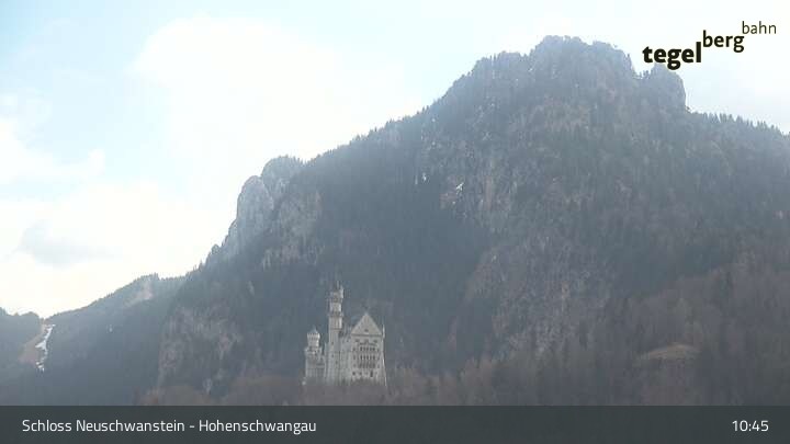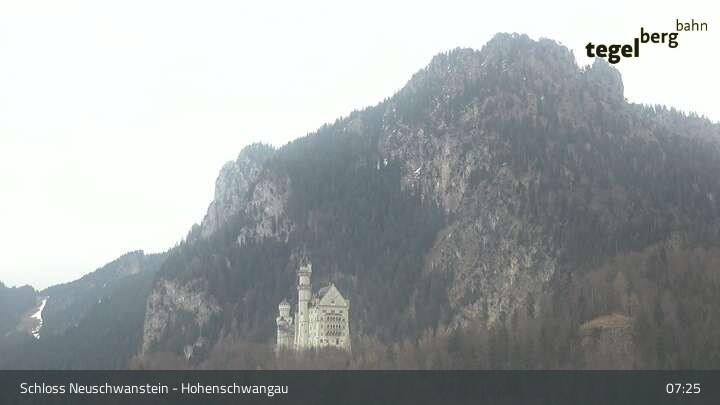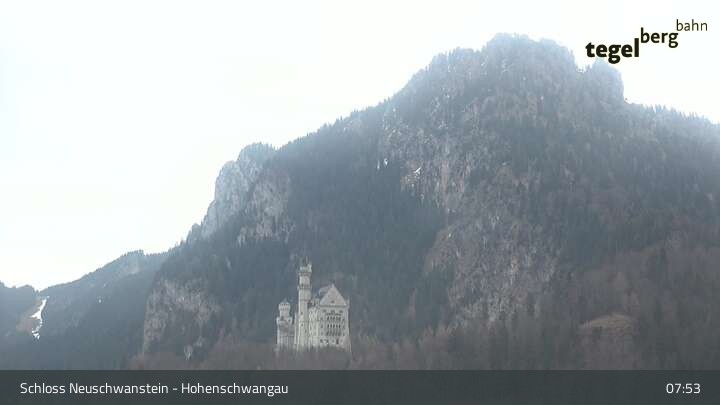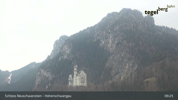 Die Kamera befindet sich am Schloss Hohenschwangau und schwenkt vom Schloss Neuschwanstein zum Museum der Bayerischen Könige.