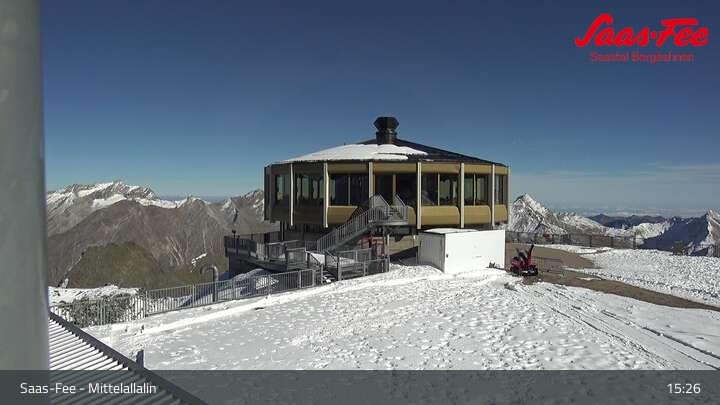 Diese Webcam auf dem Mittelallalin, einem Nebengipfel des Allalinhorns in Saas-Fee zeigt das Drehrestaurant, von dem aus man die Aussicht auf die umliegenden Walliser Alpen genießen kann.