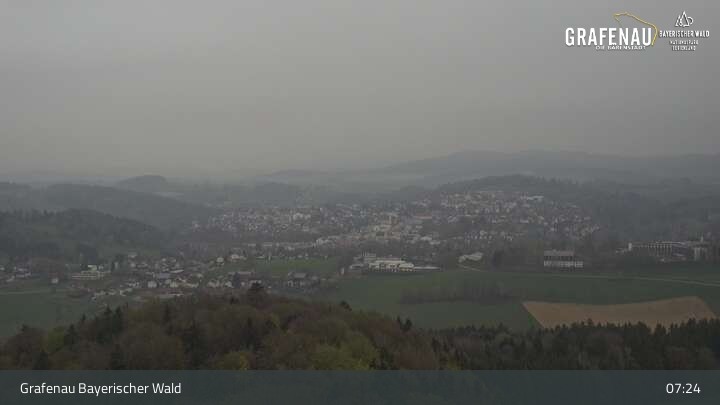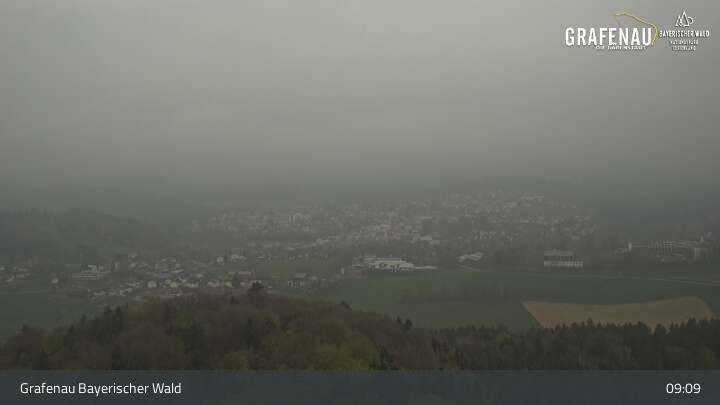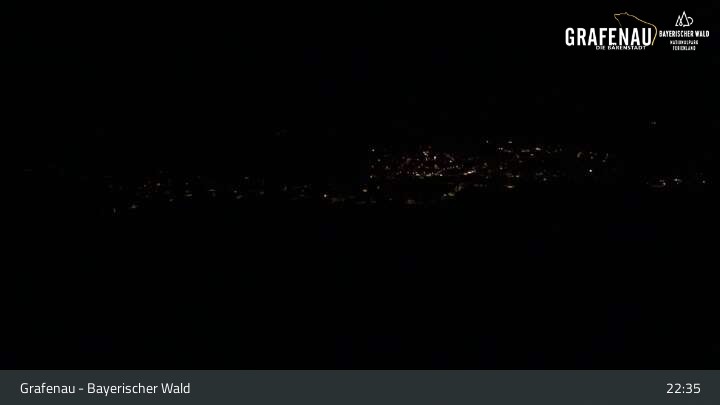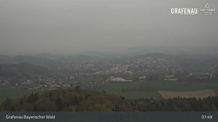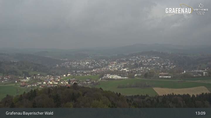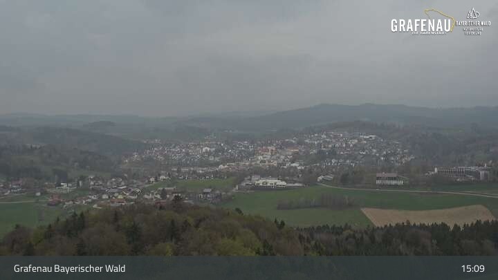 Genieße den Ausblick auf den Luftkurort Grafenau im Bayerischen Wald. Die Kamera befindet sich südlich der Stadt und blickt nach Norden über die Stadt zum Nationalpark Bayerischer Wald.
