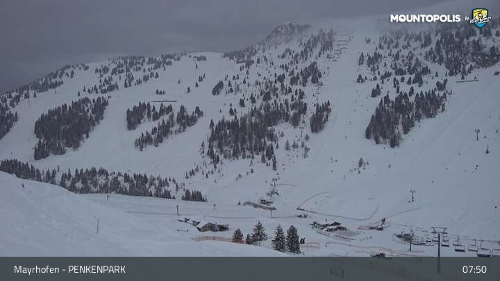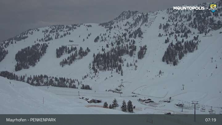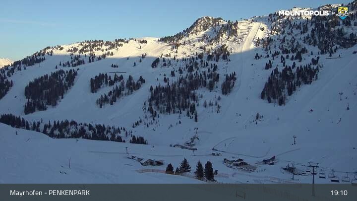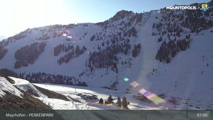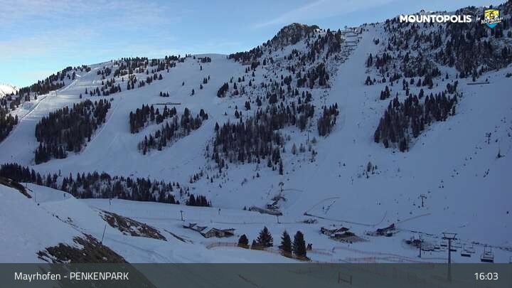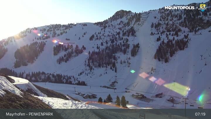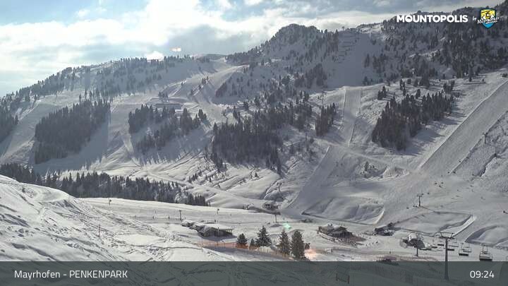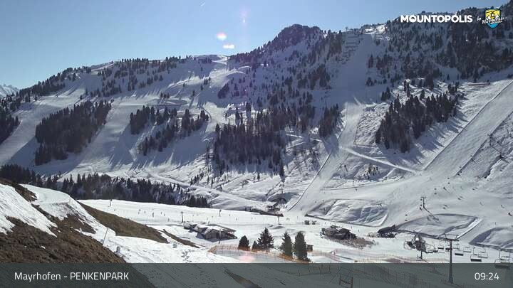 Hier blickst du auf den Vans Penken Park sowie den Sun-Jet Lift im Skigebiet Mayrhofen.