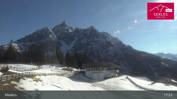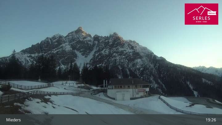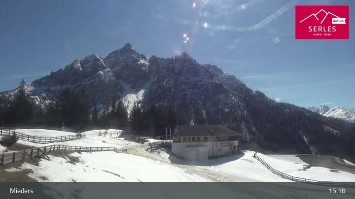 Die Webcam eröffnet den Blick von der Bergstation Koppeneck auf den Hausberg von Mieders, die Serles. Zu sehen sind außerdem das Bergrestaurant Koppeneck mit Kinderspielplatz und der Speichersee.