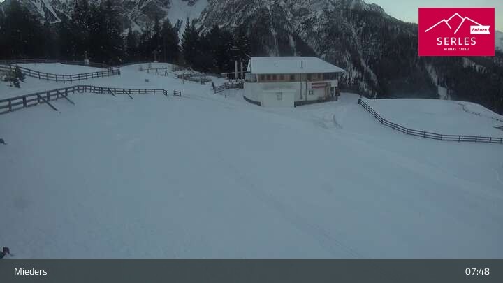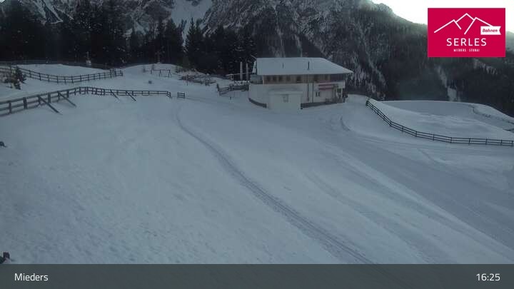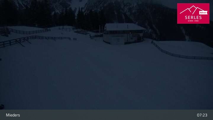 Die Webcam eröffnet den Blick von der Bergstation Koppeneck auf den Hausberg von Mieders, die Serles. Zu sehen sind außerdem das Bergrestaurant Koppeneck mit Kinderspielplatz und der Speichersee.