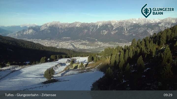 Die Webcam ermöglicht einen tollen Panoramablick auf die Landschaft am Glungezer. Das Bild wird unweit des Zirbensees aufgenommen.