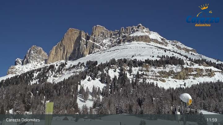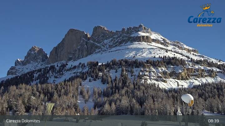 Hier siehst du die Talstation des Sessellifts Pra di Tori sowie die Berge von Carezza