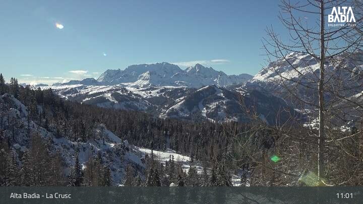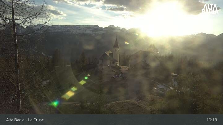 Blick von der Bergstation des La Crusc Sessellifts auf die Berge rund um Alta Badia. Die kleine Kirche ist ein beliebtes Wallfahrtsziel.