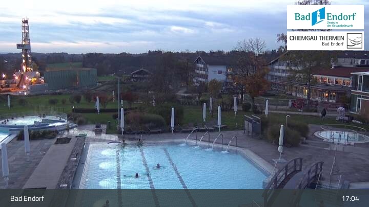 Die Webcam bietet einen Blick das Außengelände der Chiemgau Therme in Bad Endorf. Zu sehen ist unter anderem auch der 125 Meter lange Strömungskanal, ein Highlight der Therme im Landkreis Rosenheim.