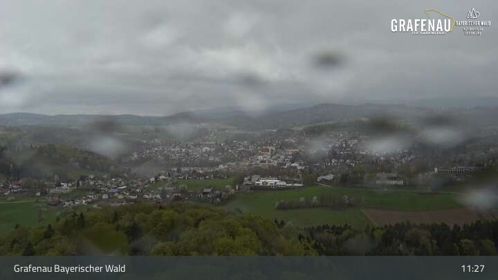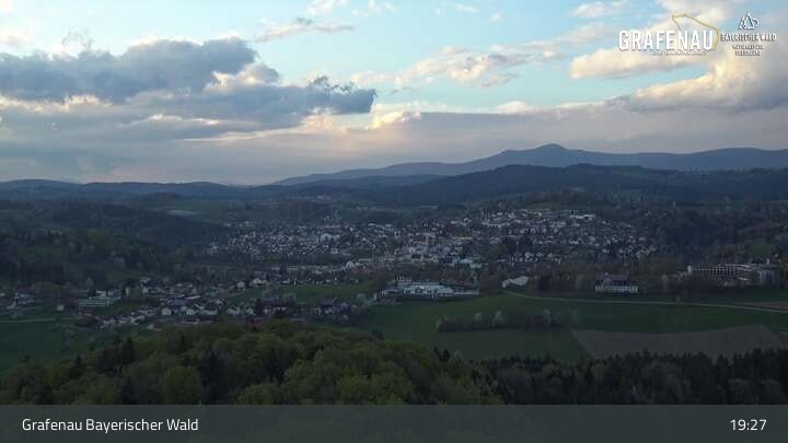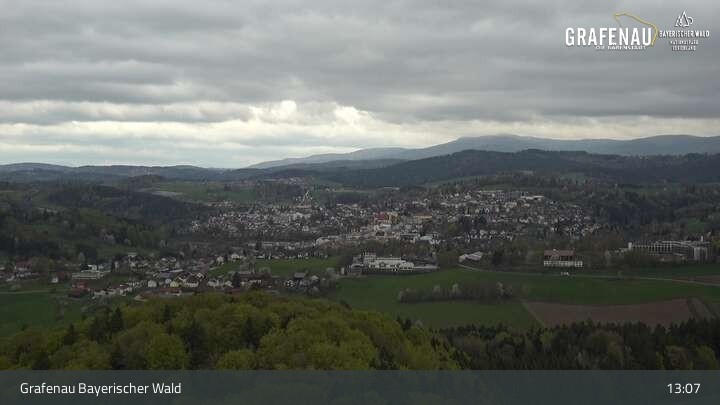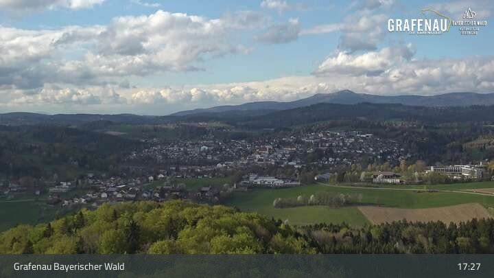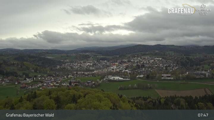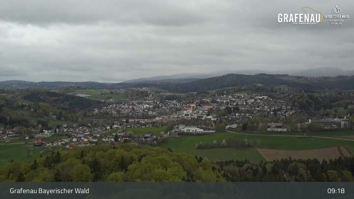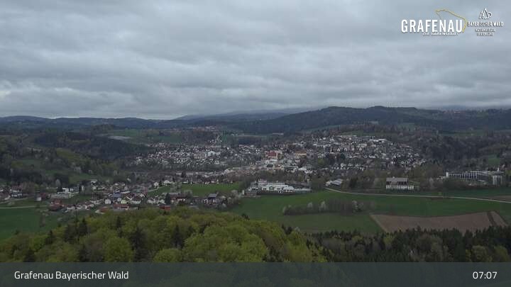 Genieße den Ausblick auf den Luftkurort Grafenau im Bayerischen Wald. Die Kamera befindet sich südlich der Stadt und blickt nach Norden über die Stadt zum Nationalpark Bayerischer Wald.