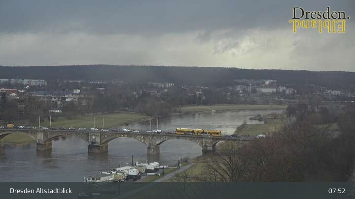 Die Kamera befindet sich am Hotel am Terrassenufer in Dresden und blickt auf die Altstadt und die Elbe.