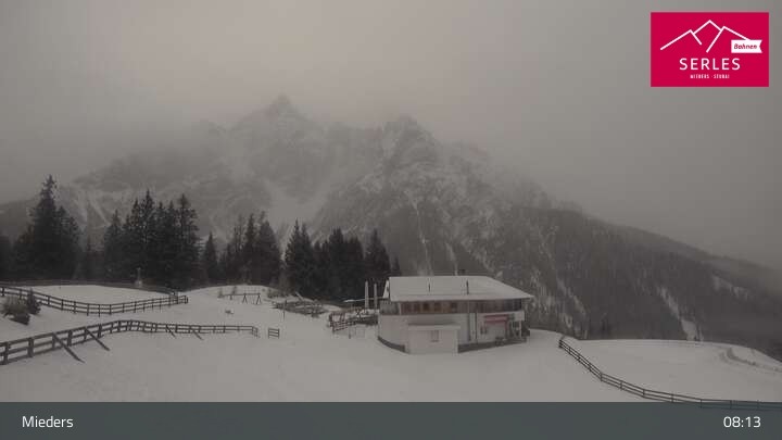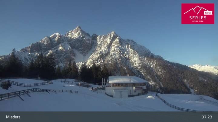 Die Webcam eröffnet den Blick von der Bergstation Koppeneck auf den Hausberg von Mieders, die Serles. Zu sehen sind außerdem das Bergrestaurant Koppeneck mit Kinderspielplatz und der Speichersee.