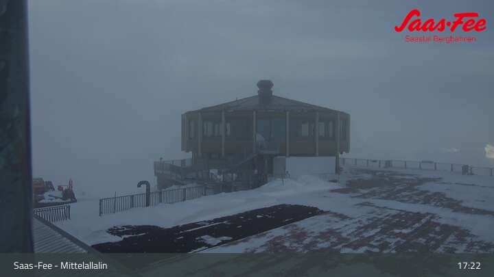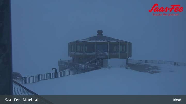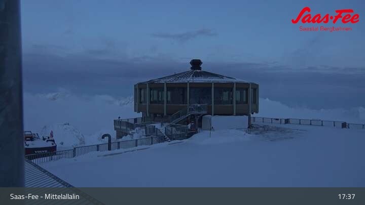 Diese Webcam auf dem Mittelallalin, einem Nebengipfel des Allalinhorns in Saas-Fee zeigt das Drehrestaurant, von dem aus man die Aussicht auf die umliegenden Walliser Alpen genießen kann.