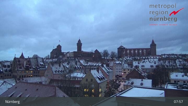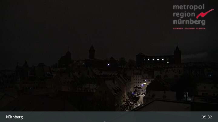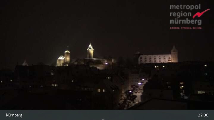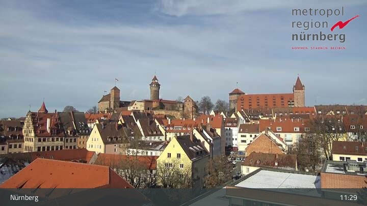 Blick über die Dächer Nürnbergs, die zweitgrößte Stadt Bayerns. Die Kamera ist in der Theresienstraße in der Altstadt positioniert und zeigt unter anderem die Kaiserburg, das Rathaus und das Staatstheater.
