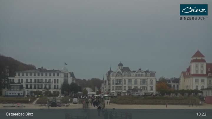 Zu sehen ist die Strandpromenade des Ostseebades Binz. Die Webcam ist auf der Seebrücke Binz positioniert und zeigt unter anderem Kurhaus, Strandpromenade und den Fischerstrand.