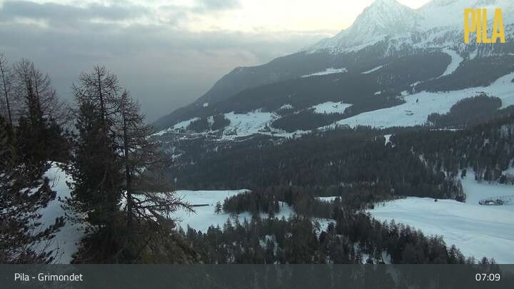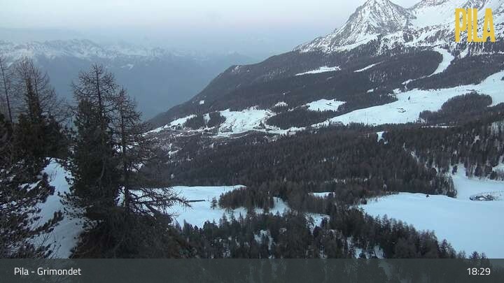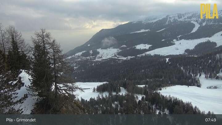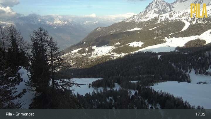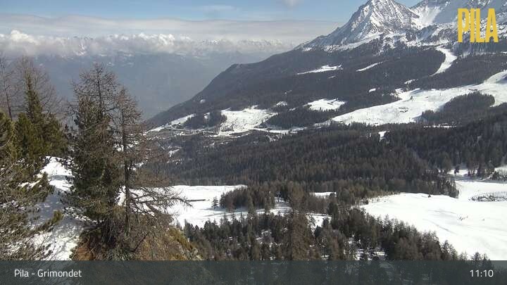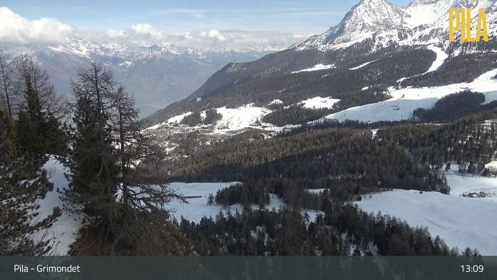 Diese Webcam an der Bergstation des Sessellifts Grimondet blickt auf die umliegende Bergwelt von Pila im Aostatal.