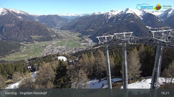 Die Kamera steht an der Bergstation der Seilbahn am Rosskopf und zeigt die Stubaier Alpen.