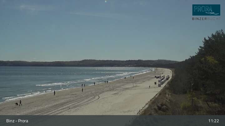 Die Kamera befindet sich auf der Insel Rügen am Strand von Prora und blickt über die Binzer Bucht.