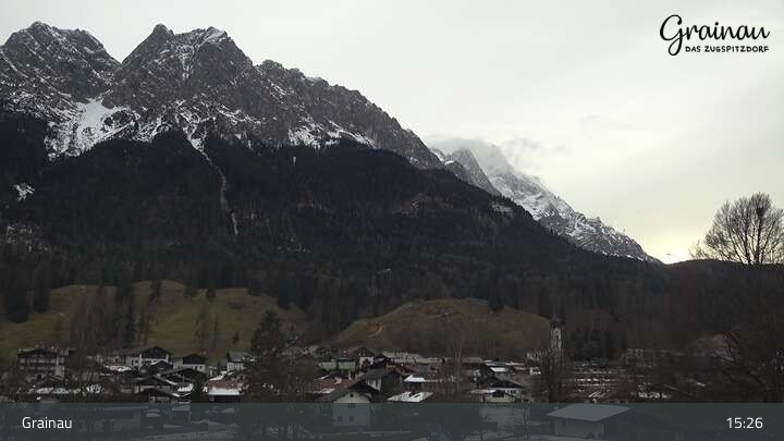 Die Live-Webcam zeigt vom Freibad aus einen Rundumblick auf das Bergdorf Grainau und seine Umgebung. Zu sehen sind unter anderem die Zugspitze, der große und kleine Waxenstein sowie der Hohe Ziegspitz.