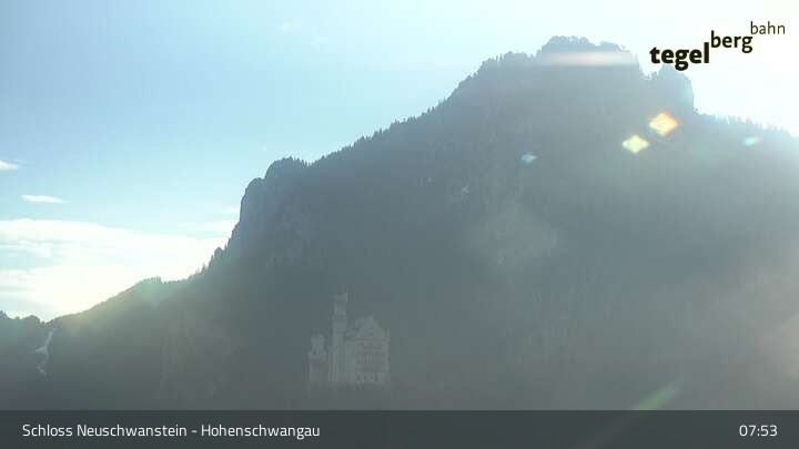 Die Kamera befindet sich am Schloss Hohenschwangau und schwenkt vom Schloss Neuschwanstein zum Museum der Bayerischen Könige.