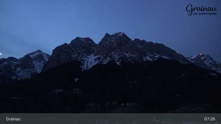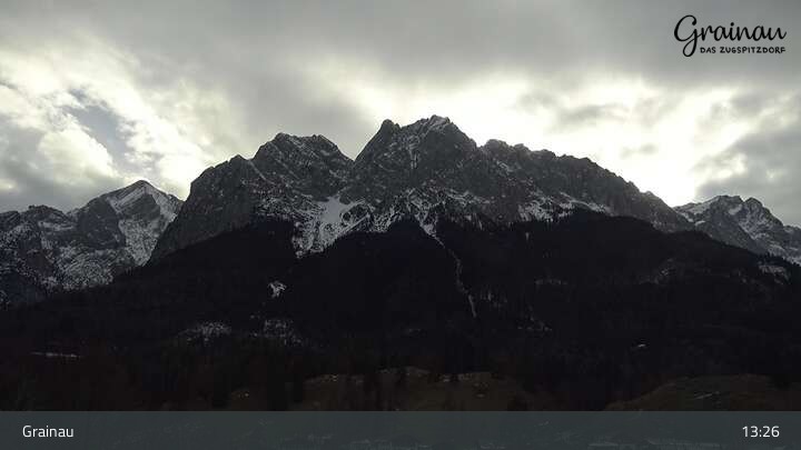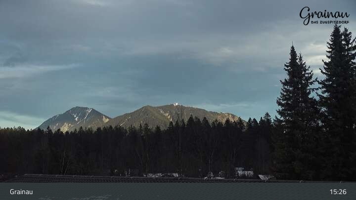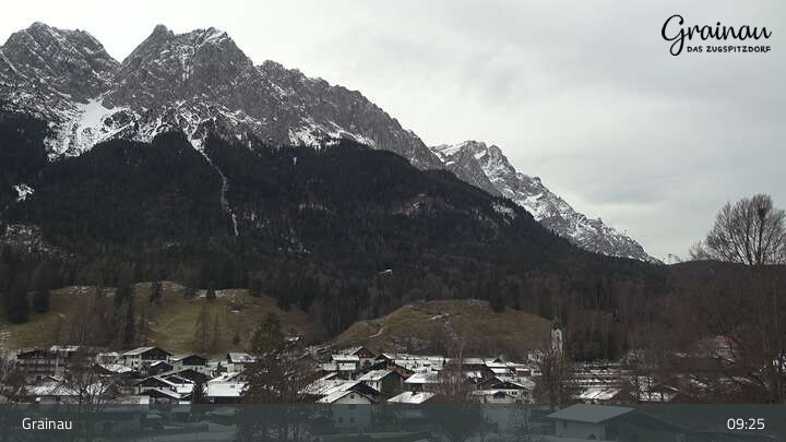 Die Live-Webcam zeigt vom Freibad aus einen Rundumblick auf das Bergdorf Grainau und seine Umgebung. Zu sehen sind unter anderem die Zugspitze, der große und kleine Waxenstein sowie der Hohe Ziegspitz.