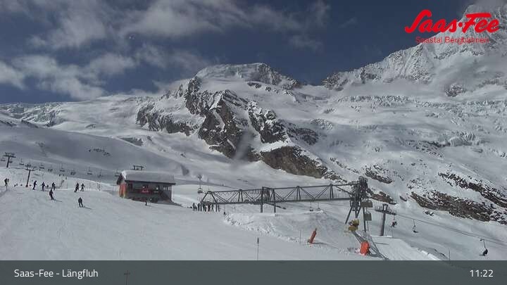 Panoramablick von der Bergstation der Längfluhbahn auf den Feegletscher.