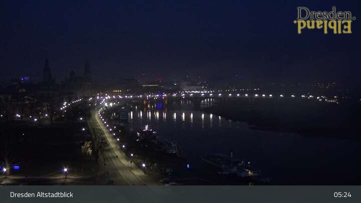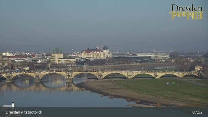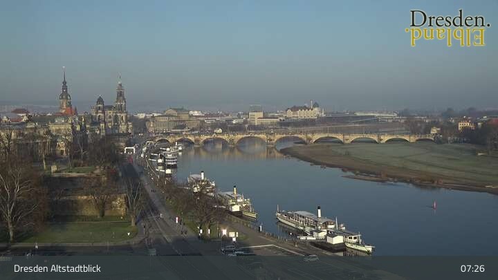 Die Kamera befindet sich am Hotel am Terrassenufer in Dresden und blickt auf die Altstadt und die Elbe.